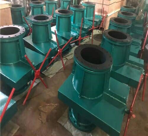 其結構與工作原理同上管夾閥。當順轉手輪時,使大小閥桿同時帶動上下閘板,壓縮管套,進行關閉,反轉即行開啟,這樣,閘板在導柱之間上下往復完成閥門開閉工作。另外,因橡膠管套承力,因此在開關時,操作人員旋轉手輪時只要感到適量抵觸,均己達到開閉極點,切勿盡力或多人輔助,禁用其他工具開閉。